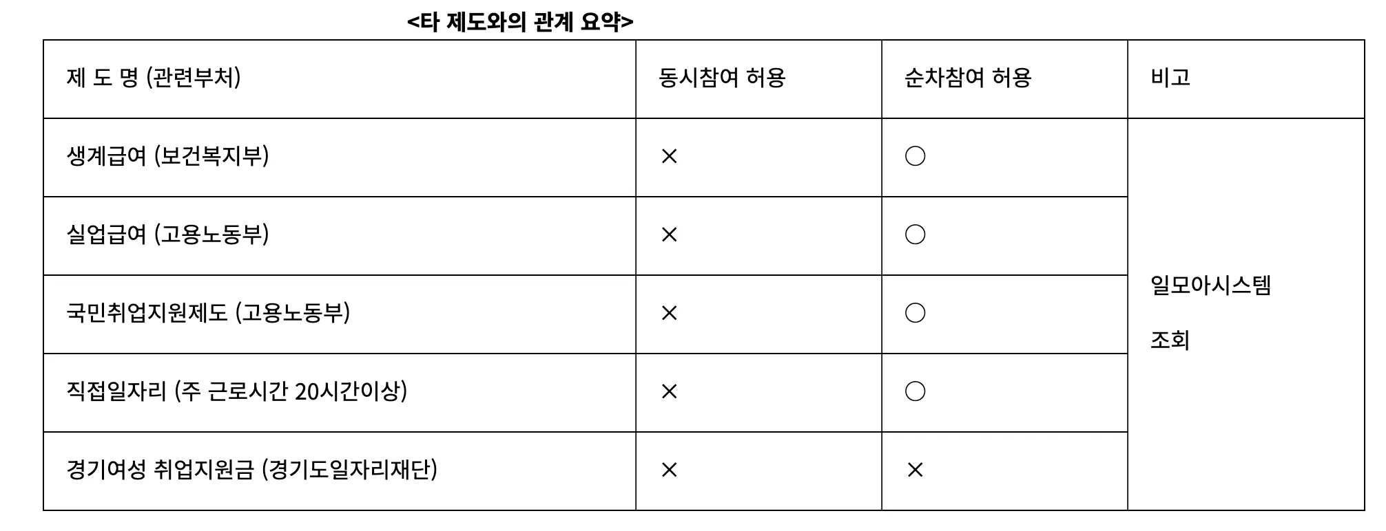 생계급여, 실업급여, 국민취업지원제도, 주 20시간 이상 직접일자리 사업과 같은 프로그램에 이미 참여하고 있으면 중복 신청이 불가능합니다. 하지만 타제도 종료 후 이미 6개월 이상이 지났다면 순차 참여는 가능합니다.