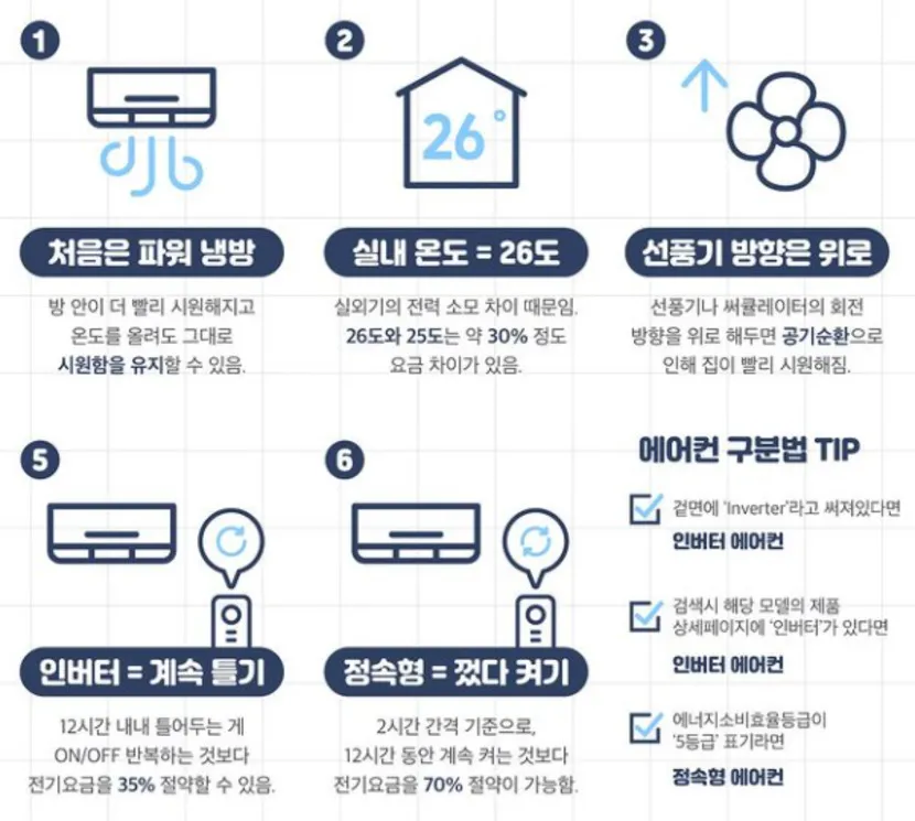 하지만 에어컨도 똑똑하게만 사용한다면 전기요금 부담없이 여름을 시원하게 버틸 수 있는 방법들이 있습니다.