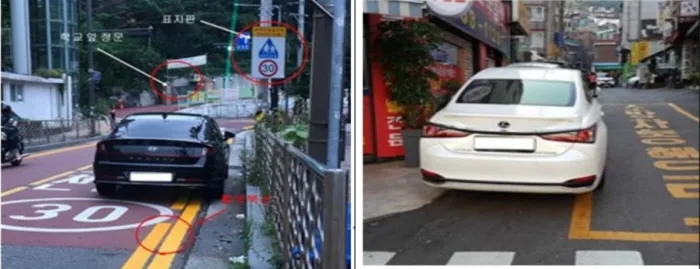 ▷황색복선 : 황색 복선이 있는 도로는 어떤 상황에서도 주정차가 금지된 도로입니다. 어떤 상황에도 예외 없이 과태료 부과 대상이 되기 때문에 가장 주의해야 하는 구간입니다.