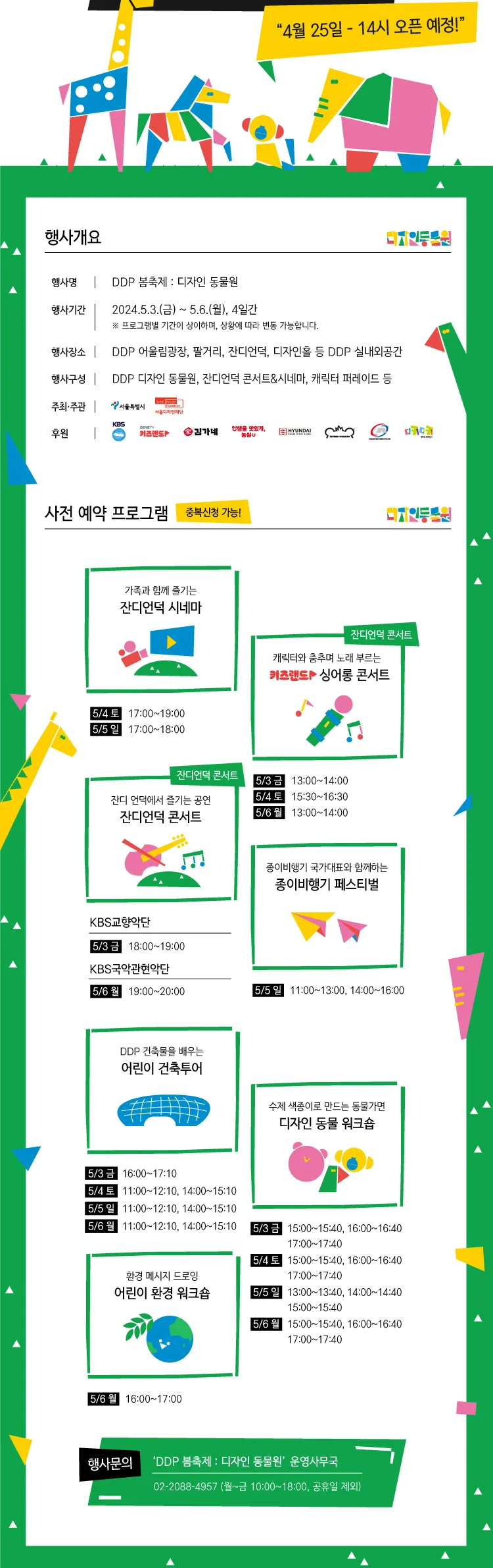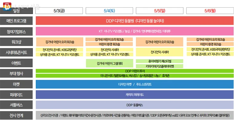 어린이날과 함께하는 DDP 봄축제 디자인 동물원 행사는 어린이들의 상상력으로 만들어 내는 디자인 동물 놀이터, 동물의 주제로 하는 클래식, 국악, 캐릭터 콘서트가 있는 잔디언덕시네마, 동물 캐릭터와 행진하는 키즈랜드 캐릭터 퍼레이드, 손수 만든 귀여운 축제 굿즈 등 다양한 프로그램들을 무료로 즐기실 수 있습니다.