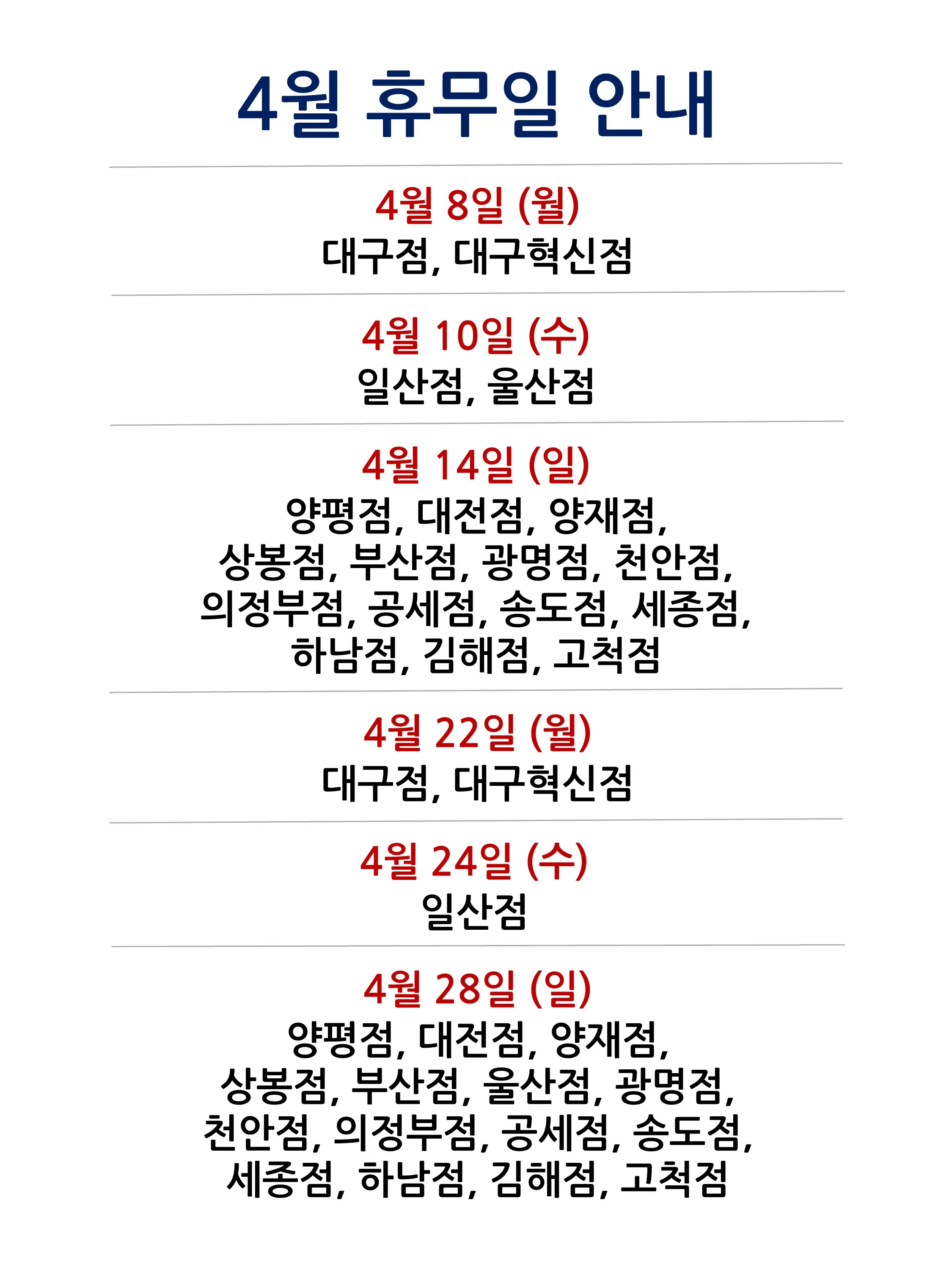 | 4월 이마트 4월 10일(수), 4월 24일(월) 휴점 매장 | |