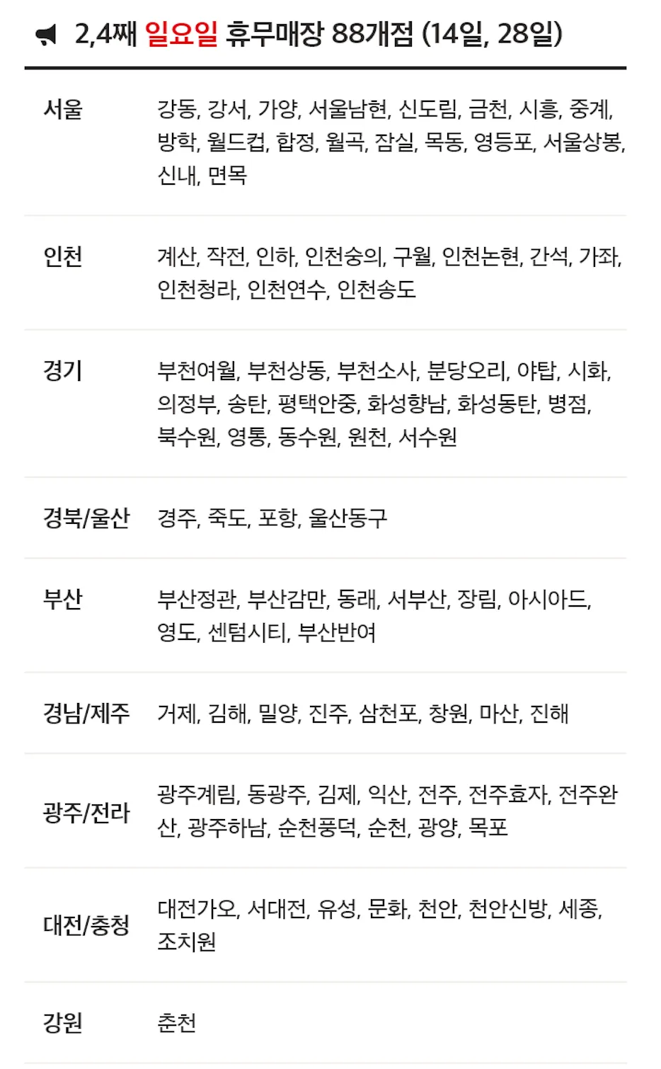 | 대전 | 노은점 대덕점 서대전점 |