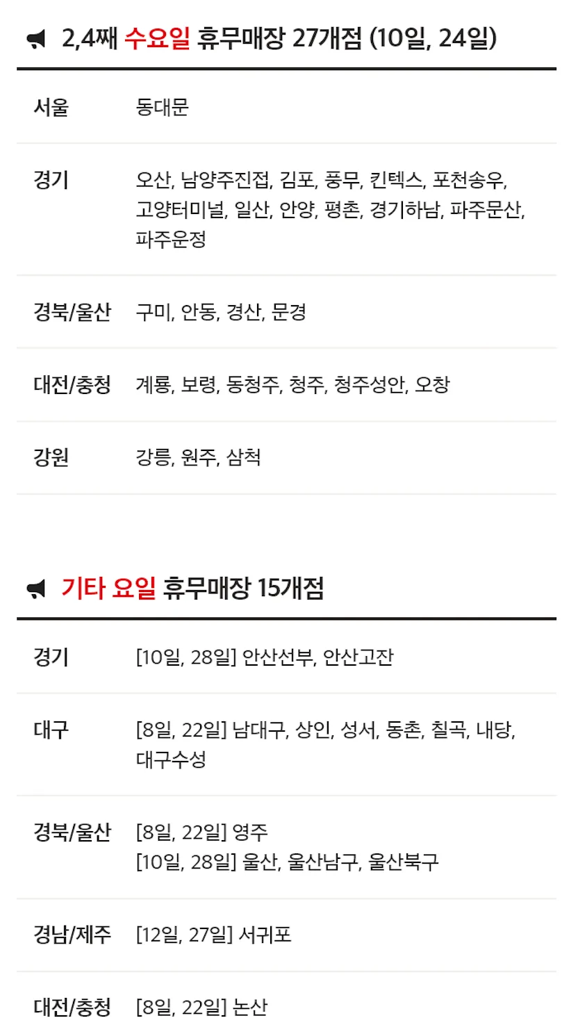 그 외 기타 요일에도 쉬는 마트들이 있으니 방문 하는 마트가 어떤 지점인지 확인후 휴무일을 체크해봅시다.