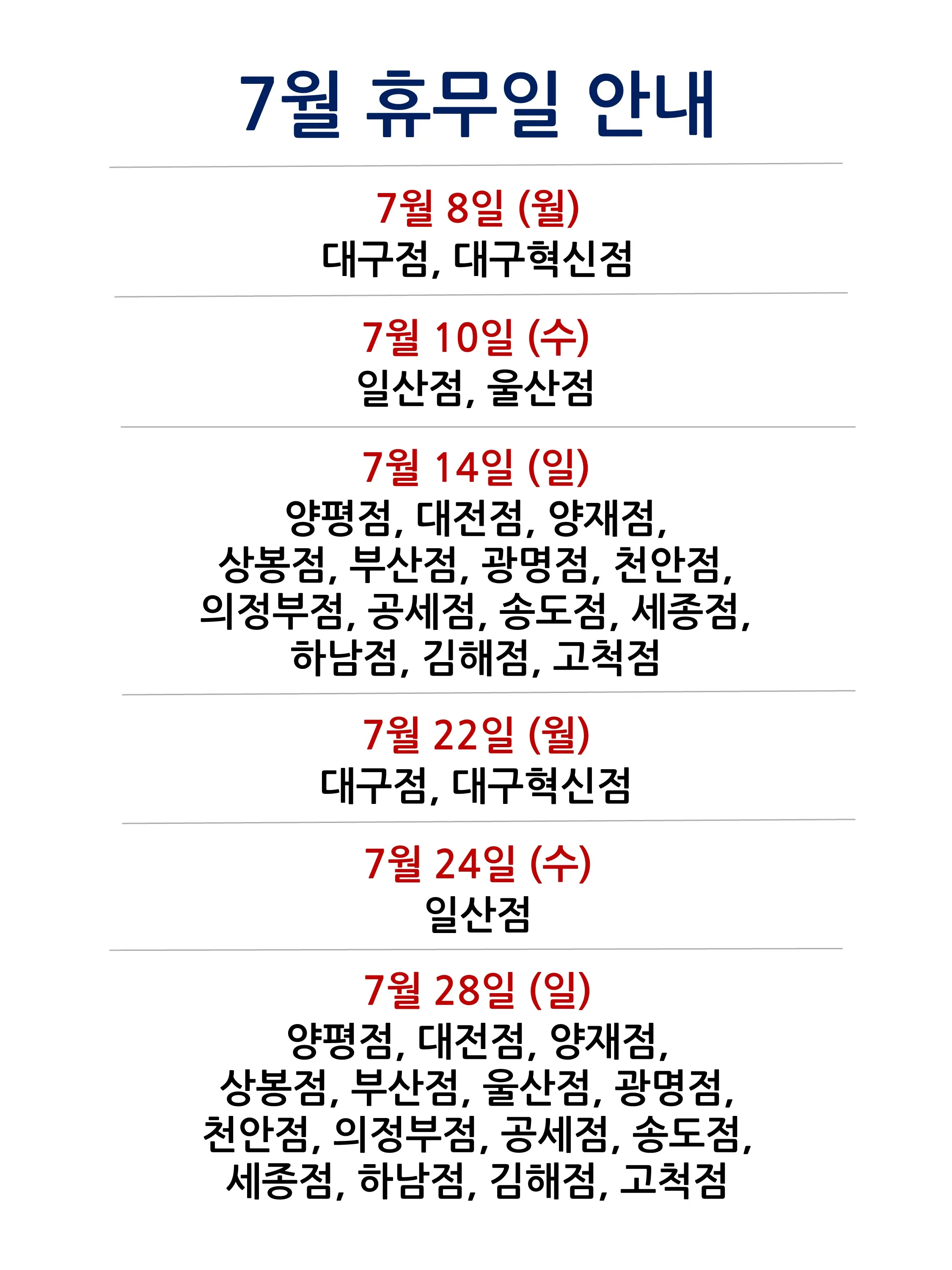 7월 휴무안내 2, 4째 일요일 휴무점포 (14일, 28일)